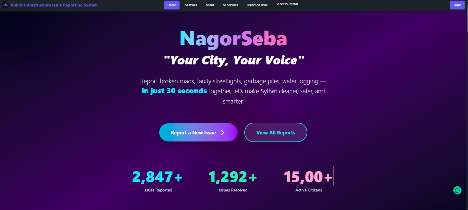 This system is a digital platform where citizens can report public issues such as broken streetlights, potholes, water leakage, garbage overflow, and damaged sidewalks.Admins and government staff can quickly manage, verify, assign, and resolve citizen reports.Premium users get priority support and can post issues for 50৳ with direct admin access.